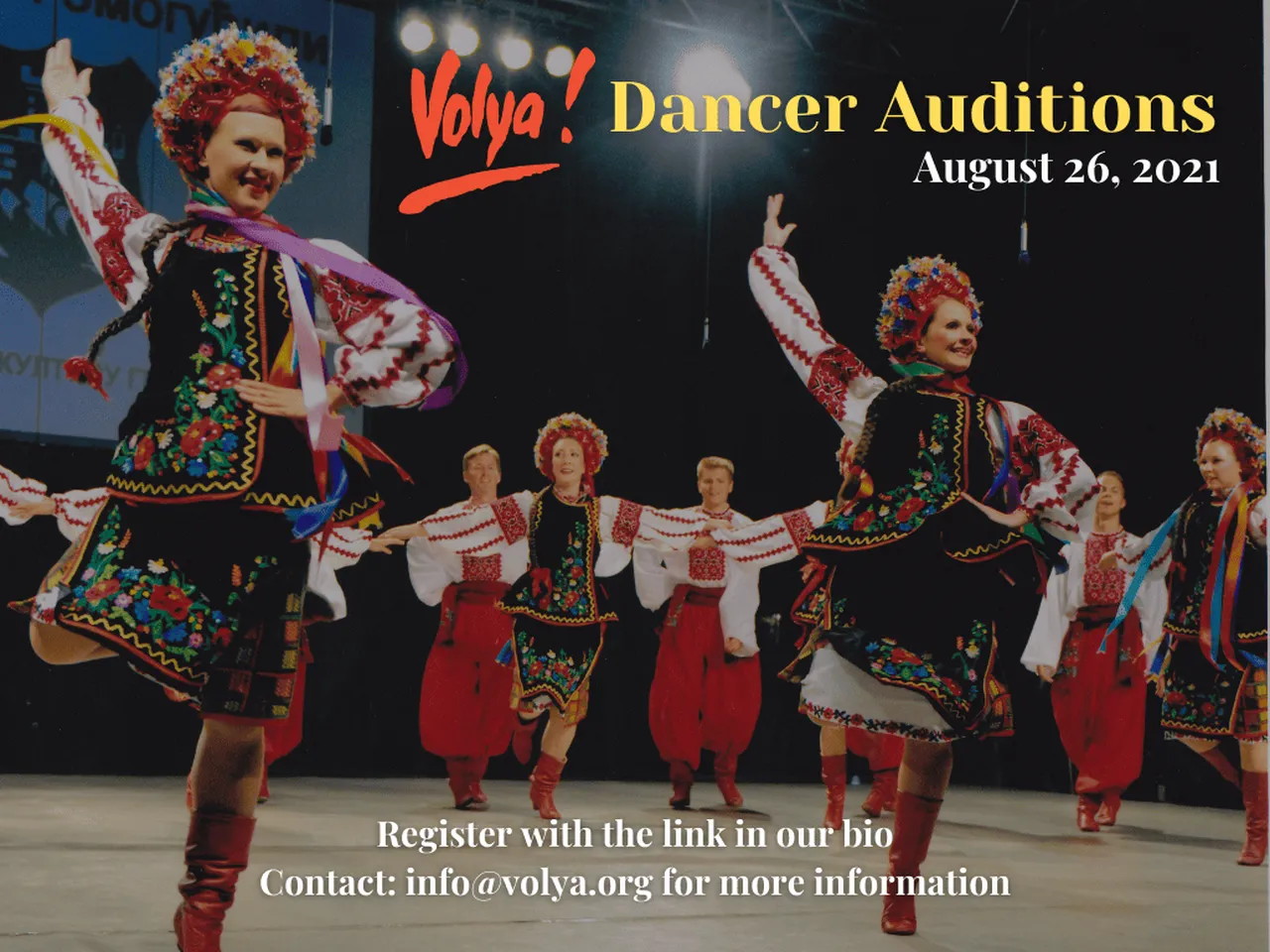 After registering you will receive more information regarding the audition. If you have any questions don’t hesitate to contact us at info@volya.org or by messaging us through facebook!